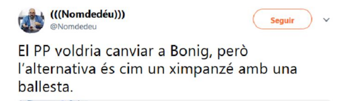 Hablamos de alguien que es reincidente en estas cuestiones y no tiene problemas en despreciar a quien se le ponga por delante, siempre que su objetivo esté en el PP. A Nomdedéu no le frena nada, ni las enfermedades; ni la dignidad personal. Aun siendo un problema de educación, lo peor de todo es que tampoco nadie le detiene, ni en Compromís ni en el Consell. De ahí que vea barra libre para descalificaciones. “Lo siento, me he equivocado, pero lo volveré a hacer”, debería poner como tuit fijado en su perfil para futuros exabruptos.