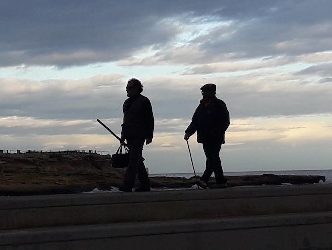 Eufrasio ha dicho muchas veces en el bar del club náutico que no entiende lo que hace Ambrosio toda la tarde mirando al horizonte sin pescar nada. Ambrosio le contesta con cierta ironía: "¿Y qué haces tú toda la tarde callado mirando como yo miro al infinito del mar?". Eufrasio siempre sonríe a este reproche y aprovecha para contar sus batallitas allá en la era cuando vivía en el pueblo tierra adentro mientras miraba su mar de surcos de la huerta. Al verlo andar detrás de Ambrosio con su bastón señorial y su cuerpo estirado, nadie diría que se levantaba al amanecer de cada día para arar sus campos y recolectar sus frutos.