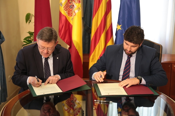 El presidente de la Generalitat, Ximo Puig, y el de la Región de Murcia, Fernando López Miras, han firmado un documento conjunto en el que reivindican un nuevo modelo de financiación autonómica e inversiones en infraestructuras. Además, instan al Gobierno central a llegar a un pacto nacional sobre los recursos hídricos.