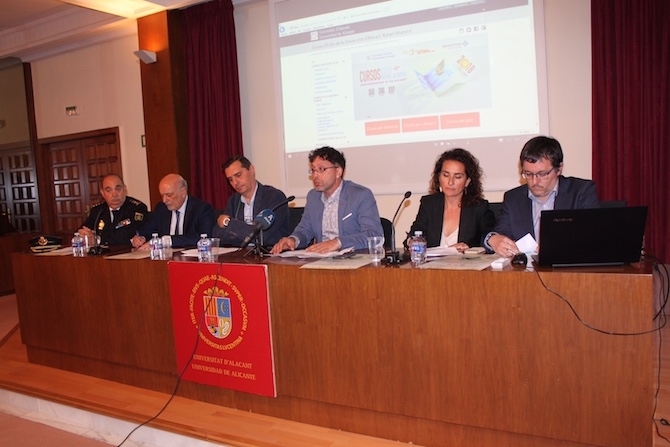El vicerrector ha estado acompañado en la presentación por el director de la Sede Ciudad de Alicante, Jorge Olcina; el nuevo coordinador técnico de los cursos Hèctor Rubio; Eva Valero, directora del Secretariado de Sedes de la UA; Fernando Candela, decano del Colegio Oficial de Abogados del Alicante (ICALI); y Antonio Sogorb, comisario jefe provincial de operaciones del CNP.