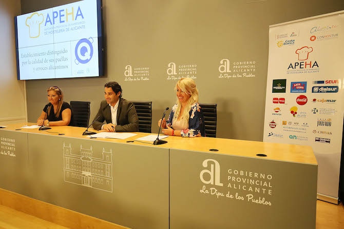 El vicepresidente y diputado de Promoción Turística, Eduardo Dolón, la presidenta de Apeha, María del Mar Valera, y la concejal de Comercio de Alicante, Marisa Gayo, han presentado esta mañana (en la imagen) los detalles de este sello que otorgará un comité de expertos en función del sabor, la textura, la temperatura y el aspecto de este tradicional plato.
