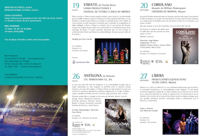 - Jueves 26 de julio. "Antígona", de Sófocles, a cargo de la compañía Ferroviaria SL, dirigida por Paco Macià. En valenciano.