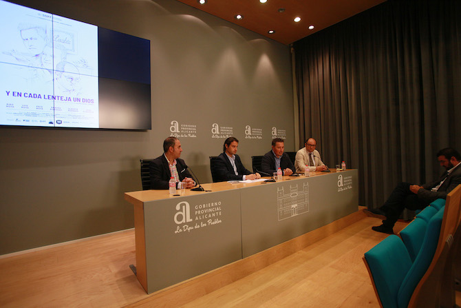 El vicepresidente y diputado de Promoción Turística, Eduardo Dolón, ha presentado esta mañana el proyecto ‘Y en cada lenteja, un Dios’, acompañado por el cocinero Kiko Moya y el sumiller Alberto Redrado, ambos impulsores de esta iniciativa, así como por el vicepresidente de la Asociación Alicante Turismo Interior, Ramón Reche.