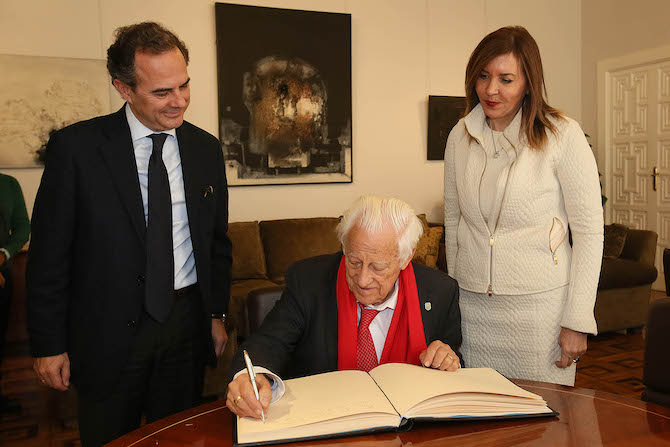 El Palacio Provincial ha recibido hoy la visita del Padre Ángel, de Mensajeros de la Paz, quien se encuentra en Alicante para participar esta tarde en el MARQ en la entrega de los I Premios Provinciales de Voluntariado que impulsa la Diputación.
