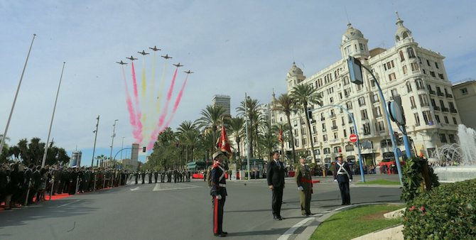 Posteriormente se ha procedido a la realización del acto militar en la Plaza del Mar, en el que se han izado la Bandera Nacional, al mismo tiempo que se disparaban un total de 21 salvas de ordenanza. A continuación se ha procedido al acto de homenaje a los caídos con la entrega de una corona de flores al monumento al Soldado de Reemplazo y finalmente ha tenido lugar el espectacular sobrevuelo de la Patrulla Águila.