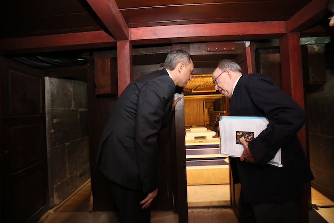 El presidente de la Diputación, el popular César Sánchez, y el párroco de San Nicolás, Ramón Egío, han visitado hoy este antiguo órgano cuya caja, de estilo plateresco manierista (Renacimiento), es la más antigua de la Comunitat Valenciana y está entre las cinco de España.