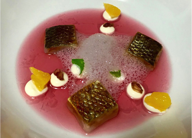 La ganadora, del restaurante Eneko (1 estrella Michelín) de Larrabetzu, ha señalado que el pescado va marinado con un toque de soplete y se termina de cocinar en el mismo plato con la acidez que proporciona el jugo de la granada.