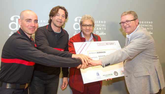 Los bomberos de la Asociación Cultural y Deportiva Bombers Marina Baixa han efectuado hoy la entrega de un cheque de 9.120 euros a la Asociación de Padres de Niños con Cáncer de la Comunidad Valenciana (Aspanion).
