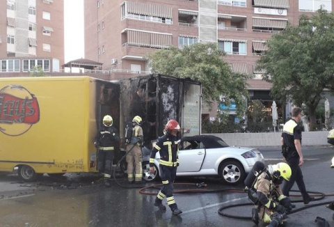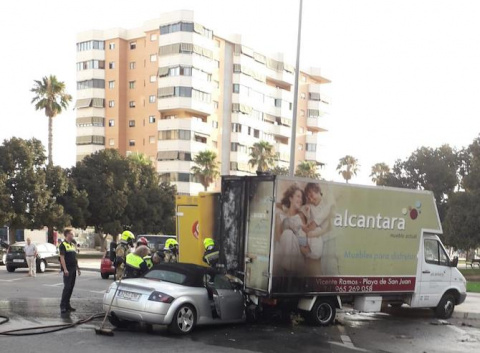 Vehículo ardiendo en la glorieta Deportista Sergio Cardell.Los bomberos del Ayuntamiento de Alicante (SPEIS) han extinguido esta mañana un aparatoso incendio originado al impactar un vehículo contra un camión en la glorieta Deportista Sergio Cardell, junto a la avenida de Miriam Blasco en la playa de San Juan.