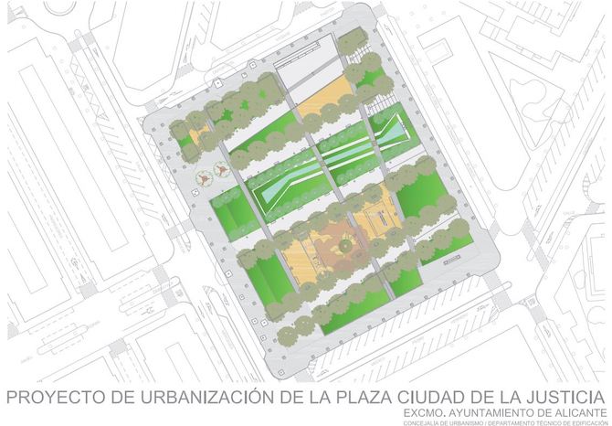 La urbanización de la Plaza de la Ciudad de la Justicia incluirá más de 8.000 metros cuadrados de zona verde e incluye itinerarios peatonales, un estanque y especies vegetales de gran porte.