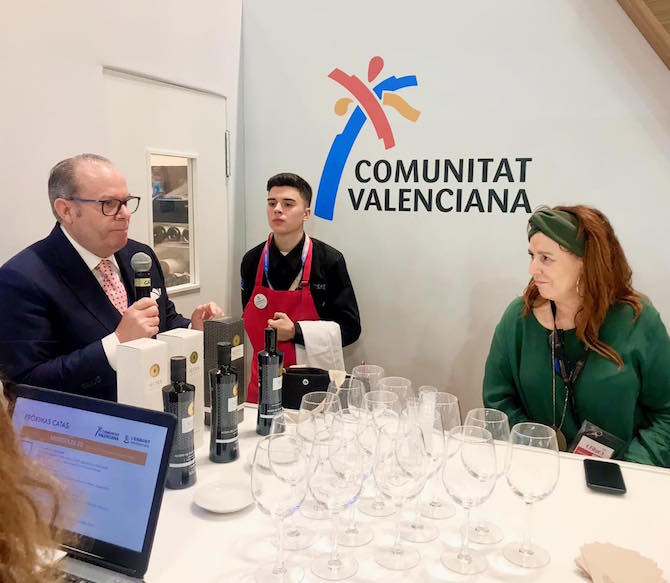 El empresario Joaquín Selma cosecha las alabanzas de visitantes y especialistas gastronómicos en la cata de su aceite SELMA Millenary Olive Oil ofrecida en el stand de Alicante.