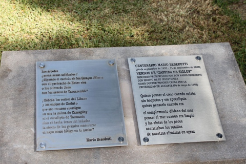 Finalizada la lectura se ha descubierto la placa conmemorativa de la efeméride, en la misma palmera que el propio Benedetti plantara en mayo de 1997, antes de la ceremonia de su investidura como Doctor Honoris Causa por la UA y en el que recitó el poema "Zapping de siglos" que, según dijo, había reservado inédito "para responder mínimamente a tanta generosidad" (El texto aparecería publicado un año más tarde en el libro La vida, ese paréntesis).