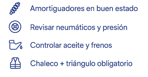 Para garantizar un trayecto seguro y sin imprevistos, además de comprobar el estado de los amortiguadores, conviene seguir una serie de pasos básicos. En primer lugar, revisar la presión y el estado de los neumáticos, asegurándose de que la profundidad del dibujo sea adecuada. También es importante comprobar los niveles de aceite, líquido de frenos y refrigerante, sin olvidar elementos como un chaleco reflectante, un triángulo de emergencia y un kit básico de herramientas que pueden marcar la diferencia ante cualquier imprevisto (también económico vía sanción de la autoridad competente).