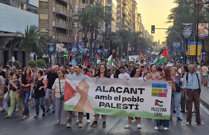 Alicante vivió este sábado por la tarde una de las movilizaciones más multitudinarias de los últimos años en apoyo a Palestina. Alrededor de 6.000 personas recorrieron las calles del centro de Alicante y 3.000 en Elche para exigir el fin de la ofensiva israelí en Gaza y la ruptura total de relaciones con Israel, según datos de la Delegación del Gobierno en la Comunidad Valenciana.