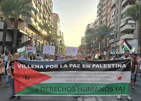 Entre los manifestantes se pudieron ver carteles con mensajes como “Villena por la Paz en Palestina”, “Derechos Humanos Ya”, “Alicante con el pueblo palestino”, “Elche por la Paz” o “Stop genocidio en Gaza”, portados por grupos llegados de distintos puntos de la provincia que quisieron mostrar su apoyo al pueblo palestino.