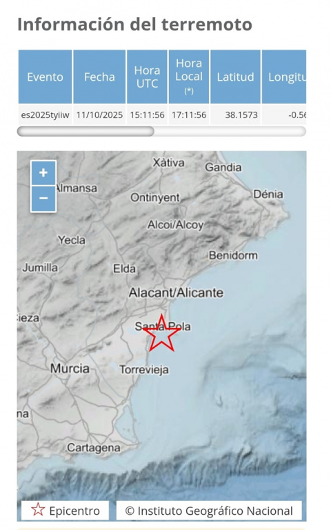 El Instituto Geográfico Nacional (IGN) ha registrado este sábado, 11 de octubre de 2025, un terremoto de magnitud 2,3 con epicentro en Santa Pola (Alicante).