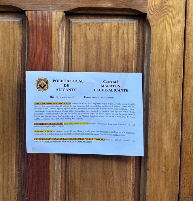 Para garantizar que los residentes conocen con antelación las afecciones, la Policía Local ha distribuido carteles informativos en los portales situados en las calles por las que discurrirá la carrera una vez entre en el término municipal de Alicante desde la avenida de Elche.