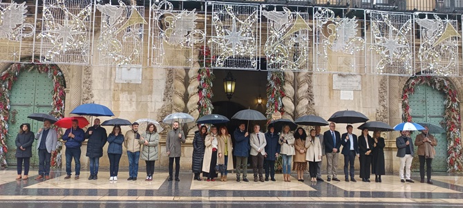 La concentración, convocada por la Federación Valenciana de Municipios y Provincias (FVMP) y la Generalitat Valenciana, ha reunido a concejales de todos los grupos de la corporación municipal, representantes sindicales y ciudadanos, que han participado bajo la lluvia en este gesto institucional de repulsa.