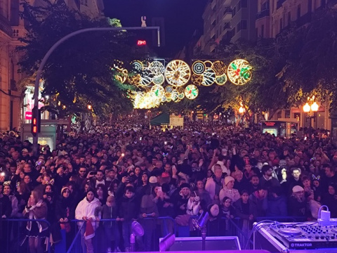 La celebración nocturna arrancó pasadas las 22:30 horas con las sesiones de varios DJ y animación previa a las campanadas. A medida que se acercaba la medianoche, se repartieron más de 2.000 bolsas con las tradicionales uvas de la suerte, una iniciativa impulsada por Mercalicante.
