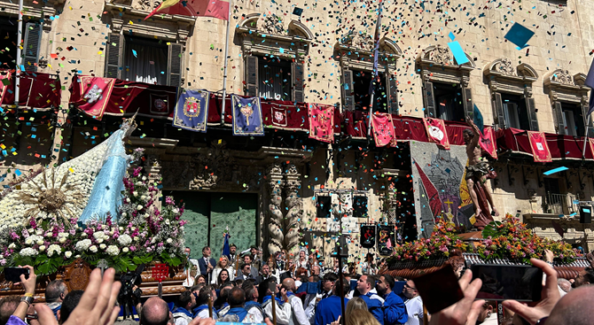 La Semana Santa de Alicante ha puesto su broche final este domingo con el tradicional Encuentro entre el Santísimo Cristo Resucitado y Nuestra Señora de la Alegría, marcado este año por el lanzamiento de más de 500.000 aleluyas desde la fachada del Ayuntamiento en la Plaza del Ayuntamiento.