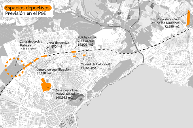 La propuesta no se limita a este gran recinto. El documento urbanístico dibuja una red de nuevos equipamientos que complementará al núcleo deportivo del Monte Tossal y sumará otras instalaciones estratégicas como un gran parque deportivo entre los PAU 4 y 5, la futura Ciudad del Baloncesto y un nuevo Centro de Tecnificación.